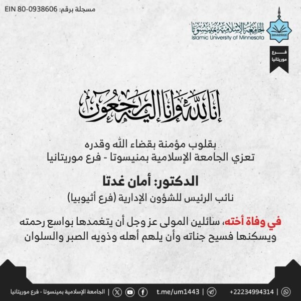 يعرض هذا التصميم الأنيق، المقدم من شركة حلول، إعلانًا تعزيةً من جامعة مينسوتا فرع موريتانيا بجمالية بصرية مؤثرة. يتصدره الخط العربي المهيب للآية الكريمة "إِنَّا لِلَّهِ وَإِنَّا إِلَيْهِ رَاجِعُونَ"، محاطًا بإطار بسيط يركز على الرسالة. يبرز اسم الفقيد الدكتور أمان غدتا وعبارات التعزية الرقيقة بخط واضح، ويكتمل التصميم بشعار الجامعة ومعلومات الاتصال بأسلوب عصري. يعكس هذا النموذج توازنًا بصريًا رفيعًا واستخدامًا رشيقًا للخطوط والألوان الهادئة، مما يدل على احترافية شركة حلول في تقديم تصاميم تجمع بين الجمال والتعبير الصادق.