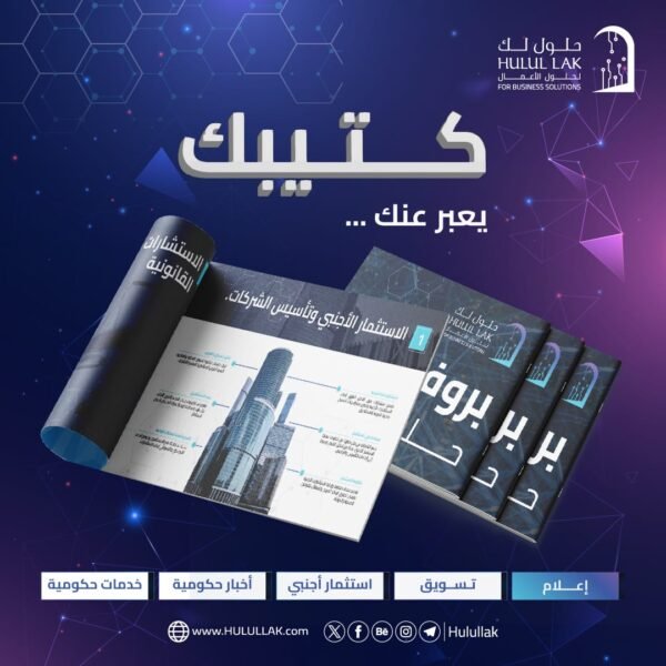 هذا التصميم الأنيق والعصري لكتيب أعمال حلول لك، بخلفيته الزرقاء الداكنة وتدرجاتها الجذابة، يبرز نموذج الكتيب المفتوح الذي يعرض صورًا احترافية ونصوصًا منسقة بدقة، وإلى جانبه نماذج مغلقة متناسقة. تتوزع في الأسفل كلمات مفتاحية تعكس مجالات عمل الشركة المتنوعة. هذا التصميم البارع يضفي جمالًا واحترافية على الموقع، ويترك انطباعًا قويًا لدى الزائر بجودة وتميز خدمات حلول لك.