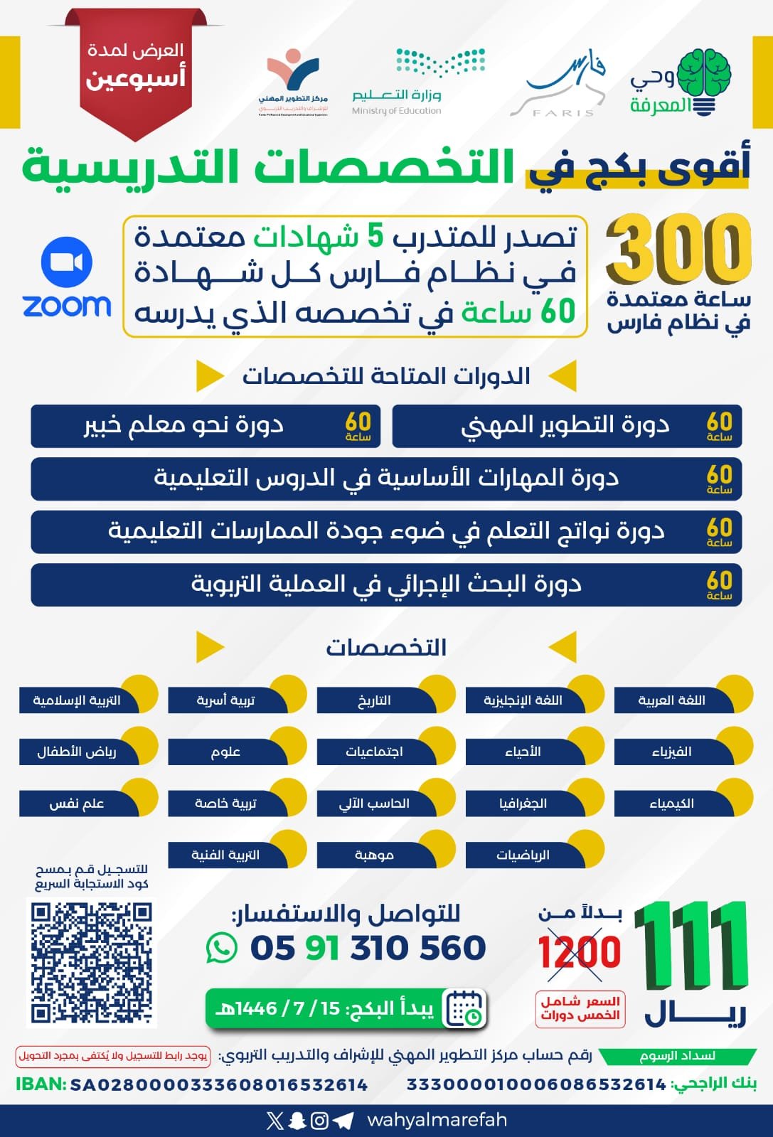 يتميز تصميم نموذج الدورات التدريبية المعتمدة للمركز التطوير المهني بالاحترافية والجاذبية من خلال نظام ألوان حيوي وتنظيم بصري دقيق للمعلومات، حيث تبرز العناوين والتفاصيل الهامة بوضوح، ويتم عرض الدورات والتخصصات بشكل منظم باستخدام أيقونات وألوان متناسقة. يولي التصميم اهتمامًا خاصًا بمعلومات التواصل والدفع، مع الحفاظ على توازن بصري واستخدام فعال للمساحات البيضاء، مما يقدم كمًا كبيرًا من المعلومات بطريقة سهلة الاستيعاب وجذابة وفعالة.