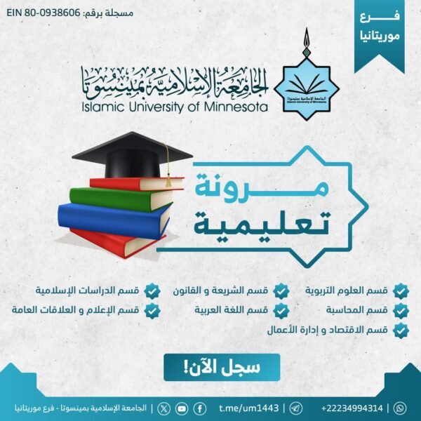 يتميز هذا التصميم الأنيق لجامعة مينسوتا الإسلامية بتكوين بصري جذاب يجمع بين قبعة تخرج وكتب ملونة ترمز إلى التنوع الأكاديمي، محاطًا بإطار إسلامي مزخرف يعكس الهوية الجامعة. تتوزع أقسام الجامعة بوضوح أسفل التصميم، مما يبرز شمولية التعليم. يعكس التصميم احترافية عالية وتوازنًا بين الأصالة والحداثة، مما يجعله نموذجًا بصريًا قويًا وجذابًا يعبر عن قيمة التعليم ويتماشى مع جودة خدمات شركة حلول.