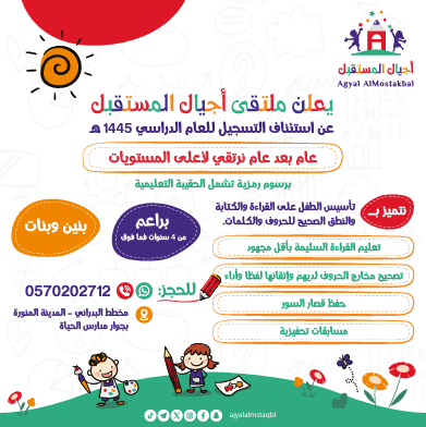 يجسد شعار حضانة أجيال المستقبل مفهوم النمو والتطور. القلم الرصاص الذي يشبه المنزل يرمز إلى البيئة الحاضنة التي توفرها الحضانة للأطفال، حيث ينمون ويتطورون. الأطفال الذين يقفزون يرمزون إلى الطاقة والحيوية التي تميز مرحلة الطفولة، ويعكسون الرغبة في اكتشاف العالم من حولهم. الشعار بشكل عام يعبر عن التزام الحضانة بتوفير بيئة محفزة للنمو الشامل للأطفال.