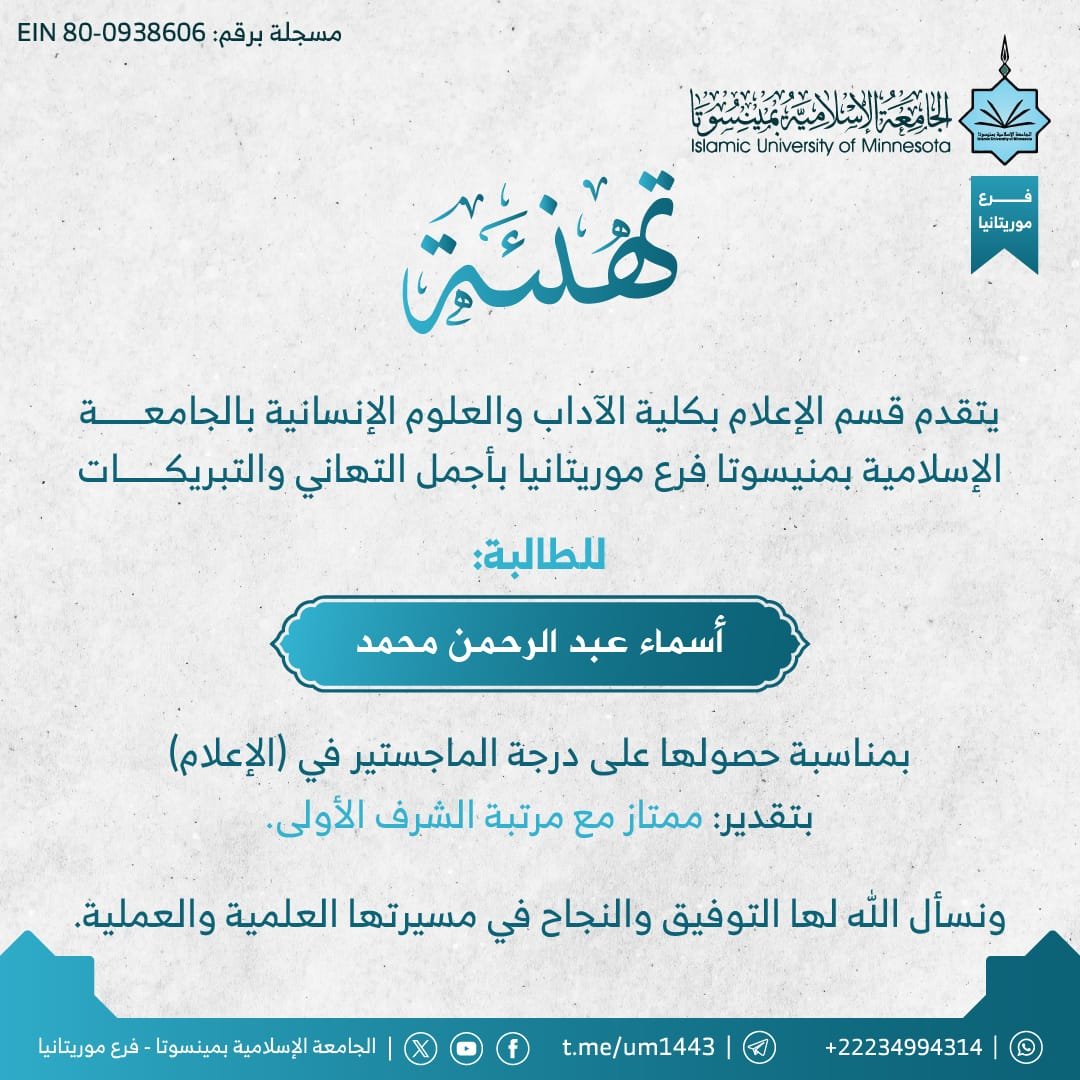 تصميم تهنئة "الجامعة الإسلامية بمينيسوتا - فرع موريتانيا" يتميز بأناقة وبساطة لافتة، حيث تبرز كلمة "تهنئة" بخط عربي فخم على خلفية بيضاء نقية، وتتوسطها رسالة واضحة بتقدير قسم الإعلام لكلية الآداب للطالبة "أسماء عبد الرحمن محمد" لحصولها على الماجستير بتقدير ممتاز مع مرتبة الشرف الأولى، مع دعاء بالتوفيق، ويُبرز التصميم اسم الطالبة في إطار أزرق أنيق، بينما تُعزز الهوية البصرية بوجود شعار الجامعة ومعلومات التواصل في الأسفل، مما يجعله نموذجًا احترافيًا يجمع بين الرقي والوضوح للاحتفاء بالإنجازات الأكاديمية.